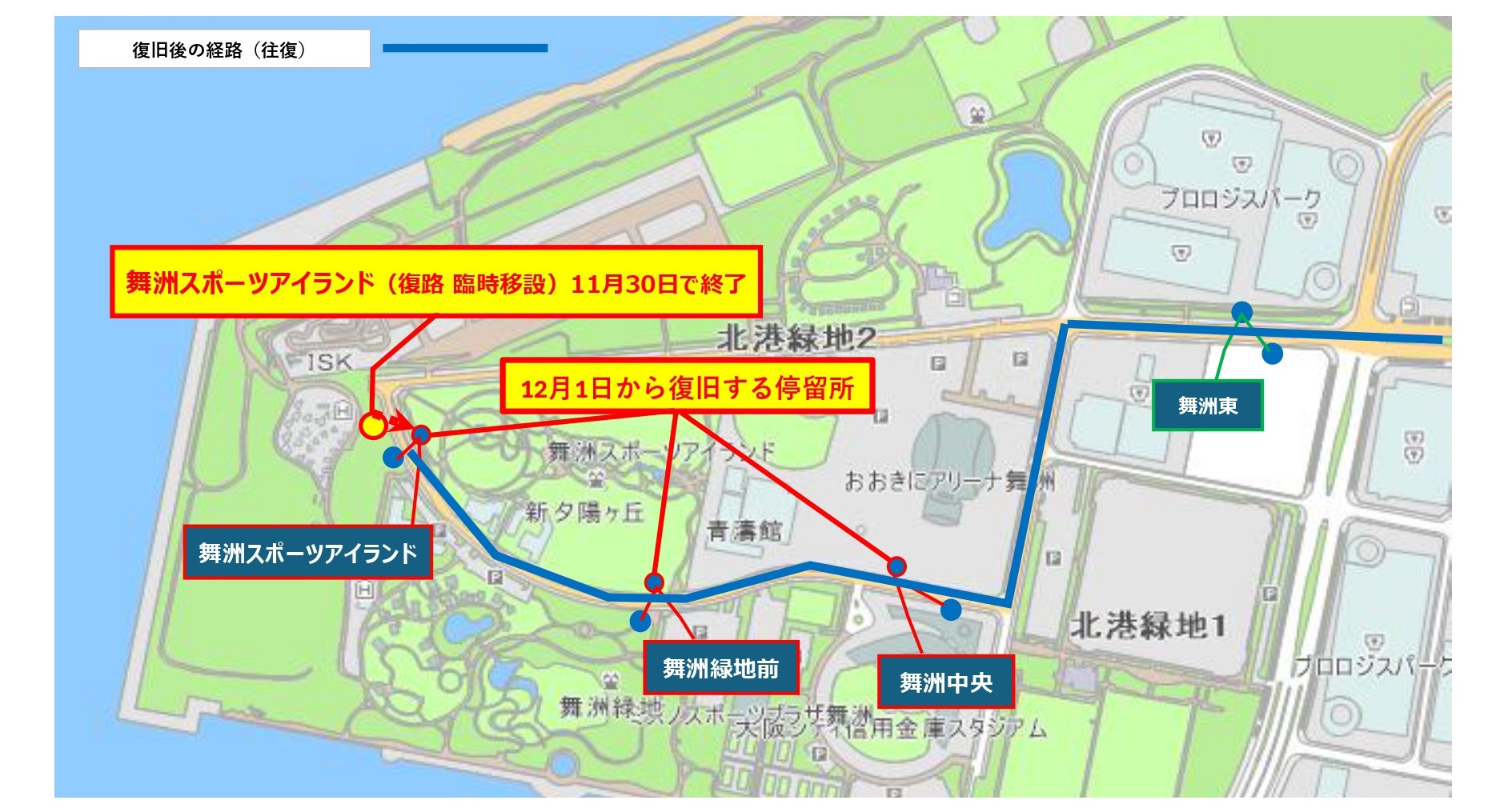 万博開催期間中およびその前後の期間において、舞洲島内の一部道路が一方通行規制されていましたが、規制が解除されるため、2025年12月1日(月)より81号系統は復路( 「舞洲スポーツアイランド」発~「西九条」行 )で経路を元の状態に復旧いたします。 それに伴い、起点となる「舞洲スポーツアイランド」停留所は臨時移設を終了して本来の停留所の位置に復旧し、休止していました復路の「舞洲緑地前」及び「舞洲中央」の2停留所も復旧いたします。 ご利用のみなさまにはご不便をおかけいたしました。