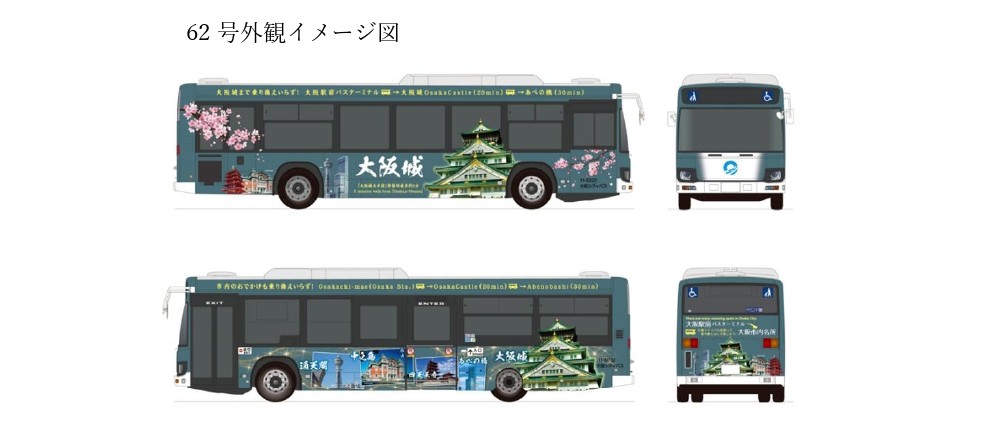 昨年9月より、「大阪城」や「大阪市中央公会堂」「あべのハルカス」など、大阪市内観光の主要スポットをつなぐ62号系統において、これらのスポットをデザインしたラッピングバスを運行しており、お客さまに好評をいただいています。
