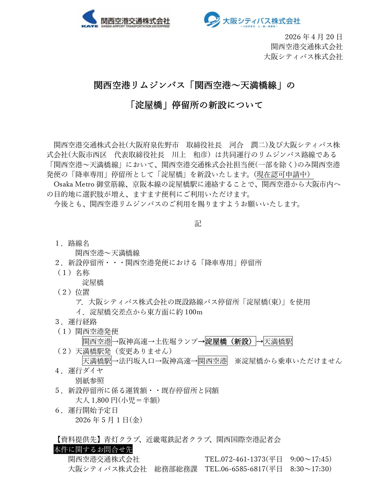 関西空港リムジンバス「関西空港~天満橋線」の 「淀屋橋」停留所の新設について